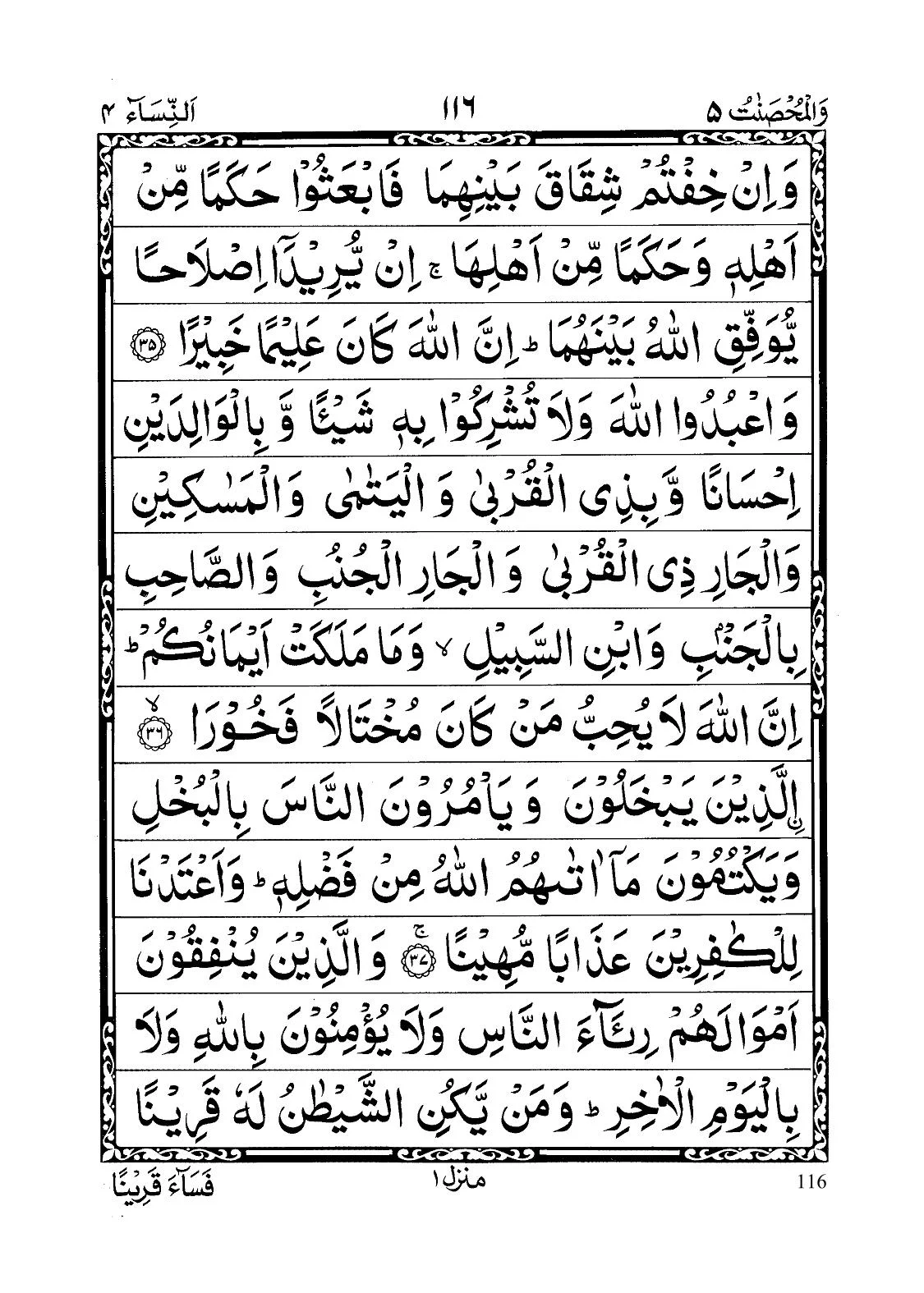 36. Wa’budul Laaha Wa Laa Tushrikoo Bihee Shai’anw Wa Bilwaalidaini Ihsaananw Wa Bizil Qurbaa Walyataamaa Walmasaakeeni Waljaari Zilqurbaa Waljaaril Junubi Wassaahibi Biljambi Wabnis Sabeeli Wa Maa Malakat Aimaanukum; Innal Laaha Laa Yuhibbu Man Kaana Mukhtaalan Fakhooraa