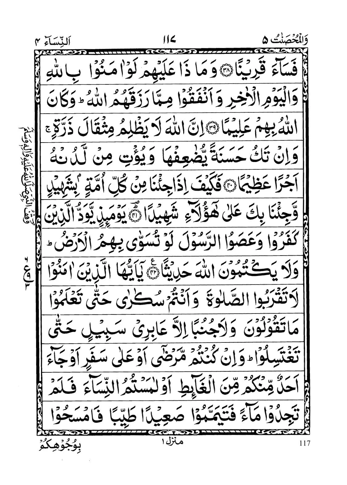 43. Yaaa Aiyuhal Lazeena Aamanoo Laa Taqrabus Salaata Wa Antum Sukaaraa Hatta Ta’lamoo Ma Taqooloona Wa Laa Junuban Illaa ‘Aabiree Sabeelin Hatta Taghtasiloo; Wa In Kuntum Mardaaa Aw ‘Alaa Safarin Aw Jaaa’a Ahadum Minkum Minal Ghaaa’iti Aw Laamastumun Nisaaa’a Falam Tajidoo Maaa’an Fatayam Mamoo Sa’eedan Taiyiban Famsahoo Biwujoohikum Wa Aideekum; Innal Laaha Kaana ‘Afuwwan Ghafooraa