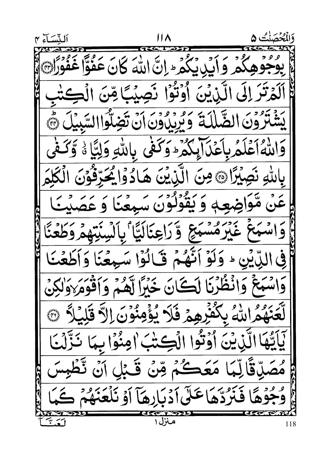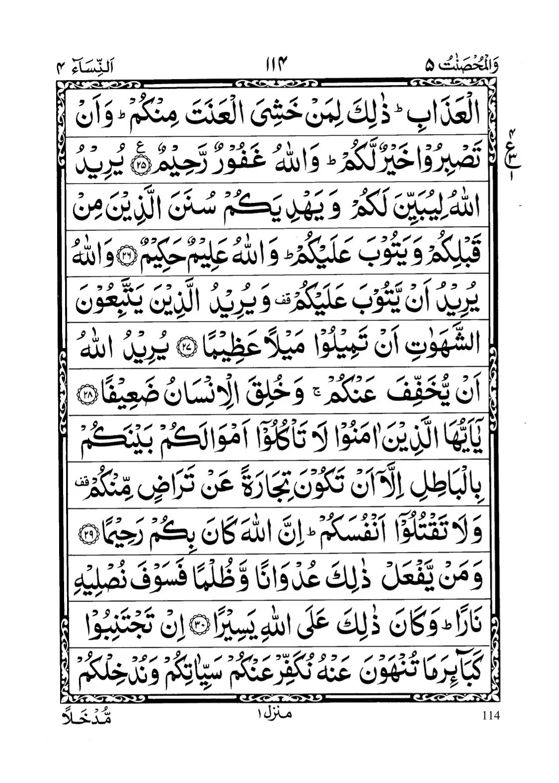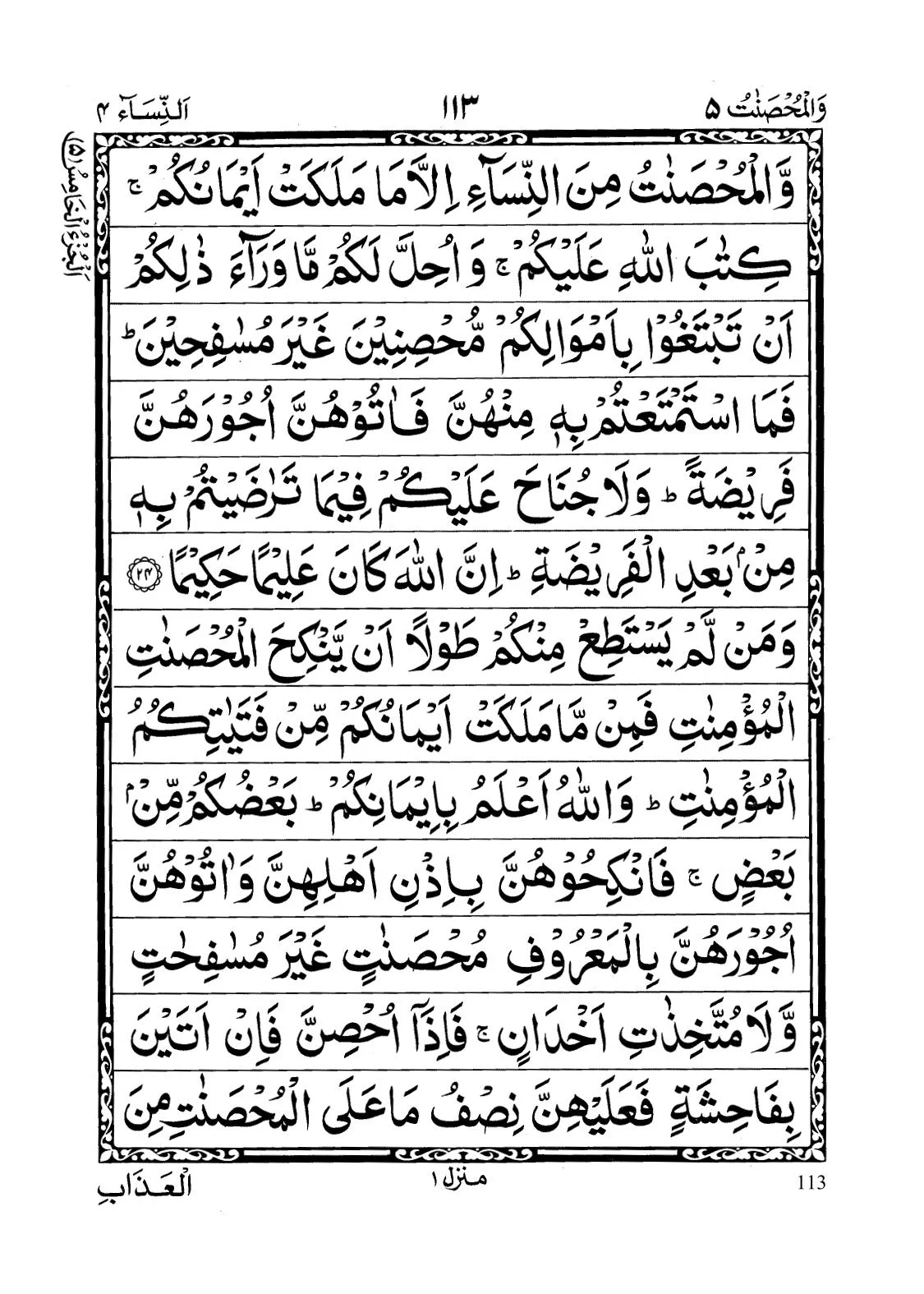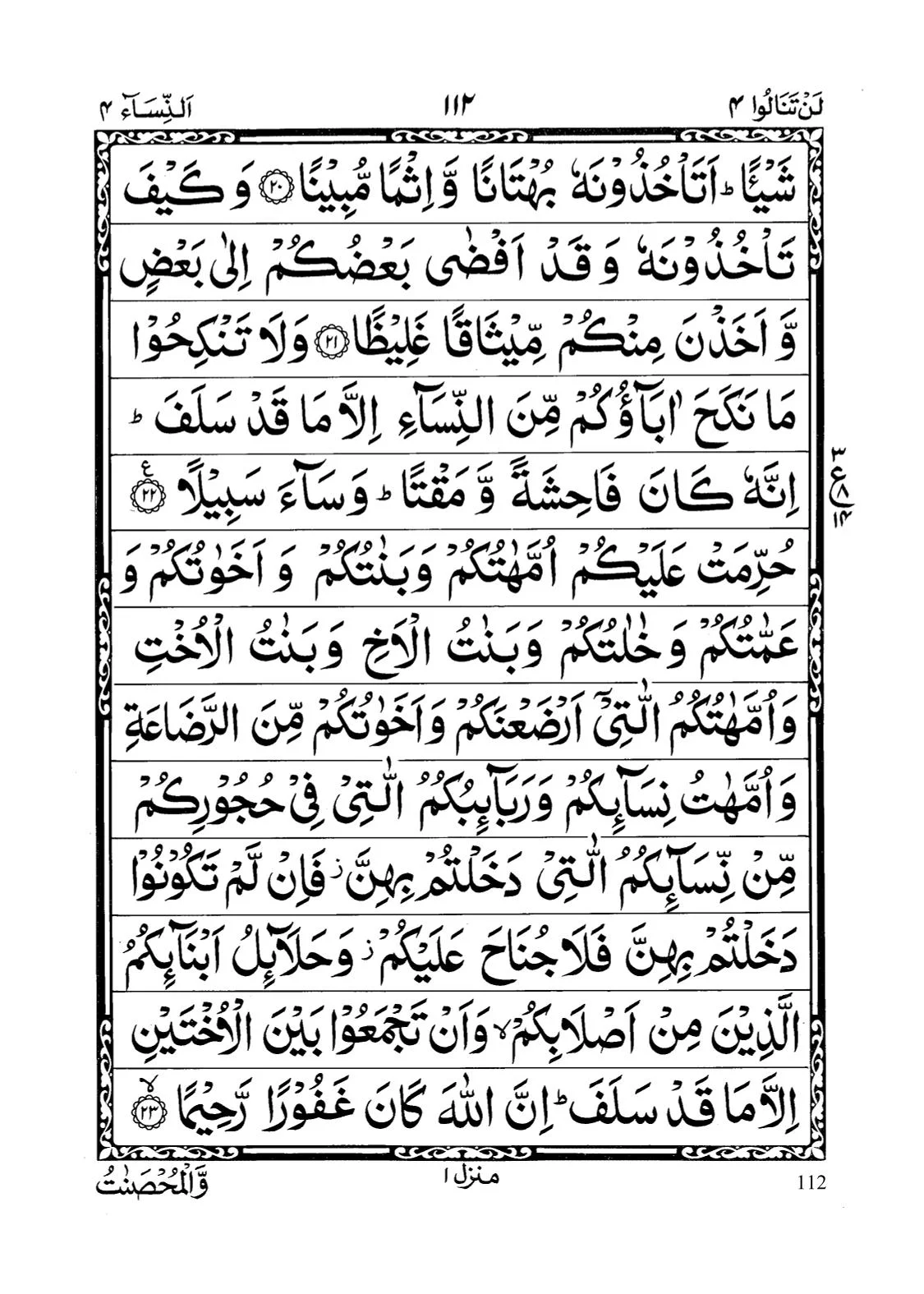 23. Hurrimat ‘Alaikum Umma Haatukum Wa Banaatukum Wa Akhawaatukum Wa ‘Ammaatukum Wa Khaalaatukum Wa Banaatul Akhi Wa Banaatul Ukhti Wa Ummahaatu Kumul Laateee Arda’ Nakum Wa Akhawaatukum Minarradaa’ati Wa Ummahaatu Nisaaa’ikum Wa Rabaaa’i Bukumul Laatee Fee Hujoorikum Min Nisaaa’ikumul Laatee Dakhaltum Bihinna Fa Il Lam Takoonoo Dakhaltum Bihinna Falaa Junaaha ‘Alaikum Wa Halaaa’ilu Abnaaa’ikumul Lazeena Min Aslaabikum Wa An Tajma’oo Bainal Ukhtaini Illaa Maa Qad Salaf; Innallaaha Kaana Ghafoorar Raheema (End Juz 4)