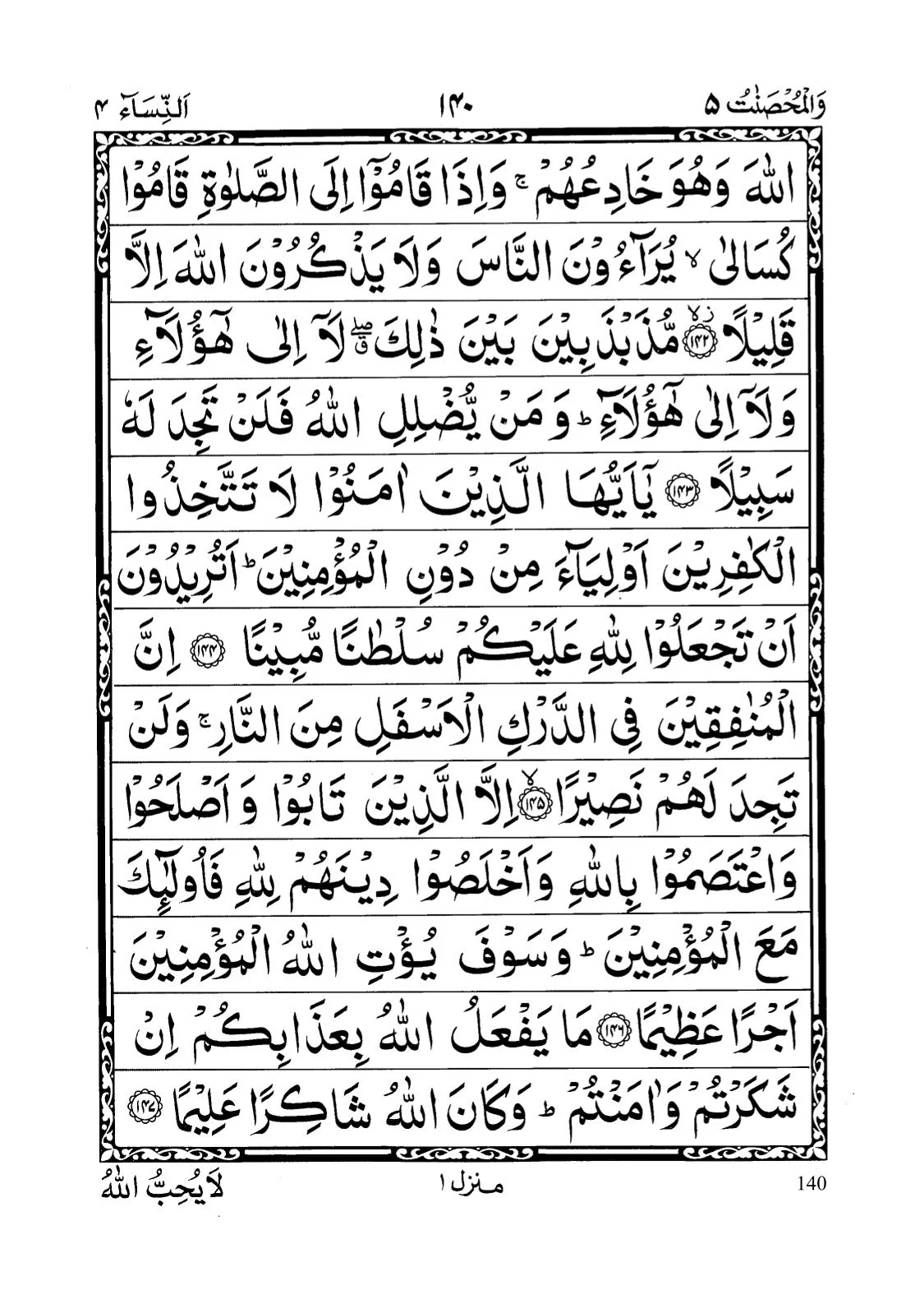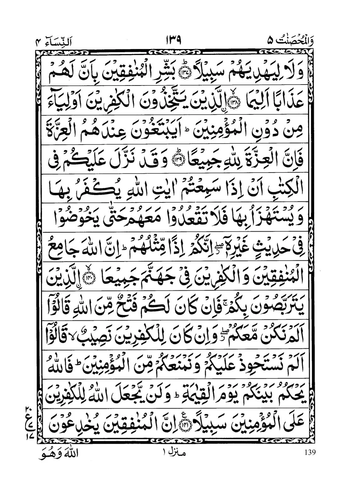 141. Allazeena Yatarab Basoona Bikum Fa In Kaana Lakum Fathum Minal Laahi Qaalooo Alam Nakum Ma’akum Wa In Kaana Lilkaafireena Naseebun Qaalooo Alam Nastah Wiz ‘Alaikum Wa Nammna’kum Minal Mu’mineen; Fallaahu Yahkumu Bainakum Yawmal Qiyaamah; Wa Lai Yaj’alal Laahu Lilkaafireena ‘Alal Mu’mineena Sabeelaa (Section 20)