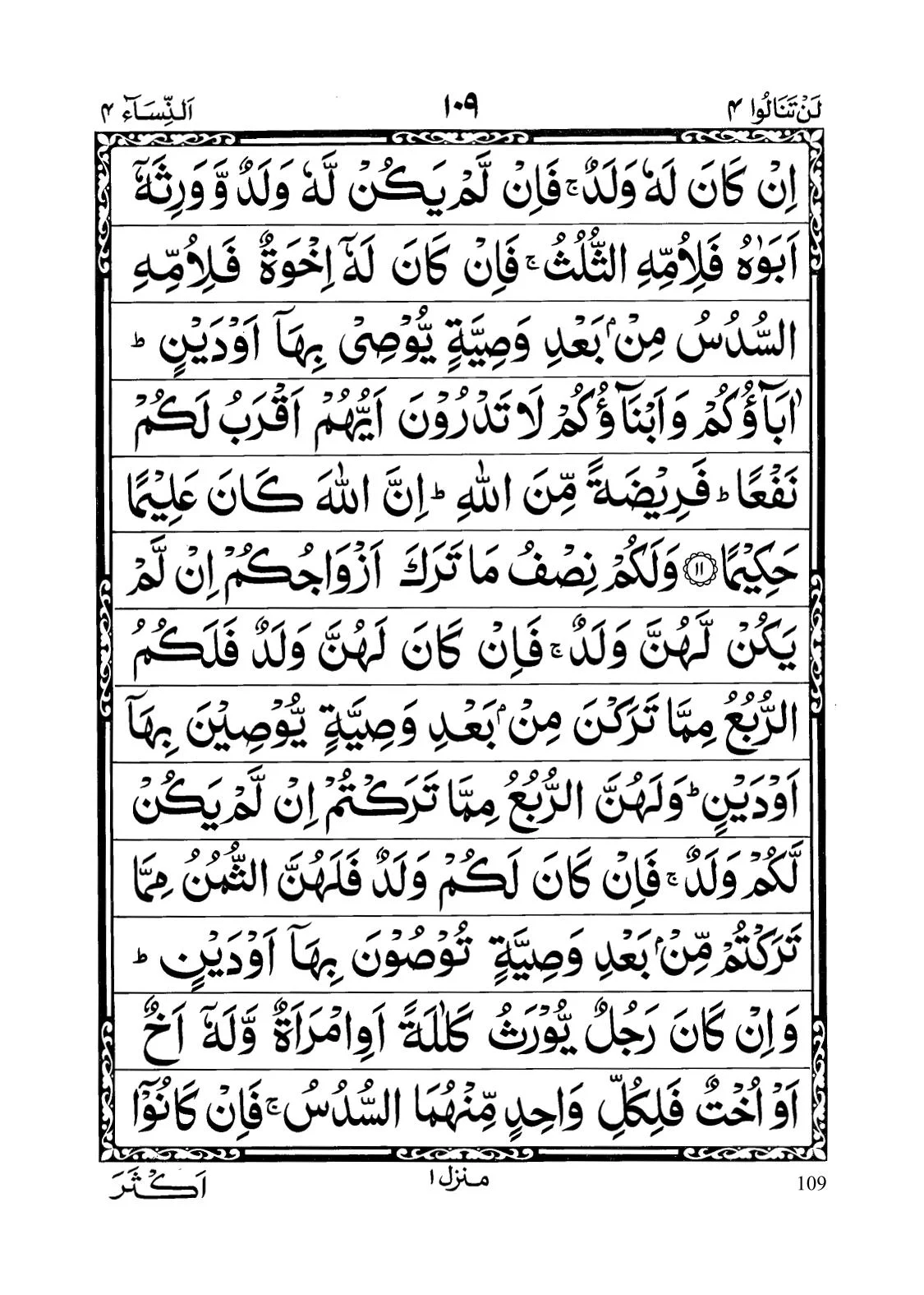 176. Yastaftoonaka Qulillaahu Yafteekum Fil Kalaalah; Inimru’un Halaka Laisa Lahoo Waladunw Wa Lahoo Ukhtun Falahaa Nisfu Maa Tarak; Wa Huwa Yarisuhaaa Il Lam Yakkul Lahaa Walad; Fa In Kaanatas Nataini Falahumas Sulusaani Mimmmaa Tarak; Wa In Kaanooo Ikhwatar Rijaalanw Wa Nisaaa’an Faliz Zakari Mislu Hazzil Unsayayn; Yubaiyinullaahu Lakum An Tadilloo; Wallaahu Bikulli Shai’in Aleem (Section 24)