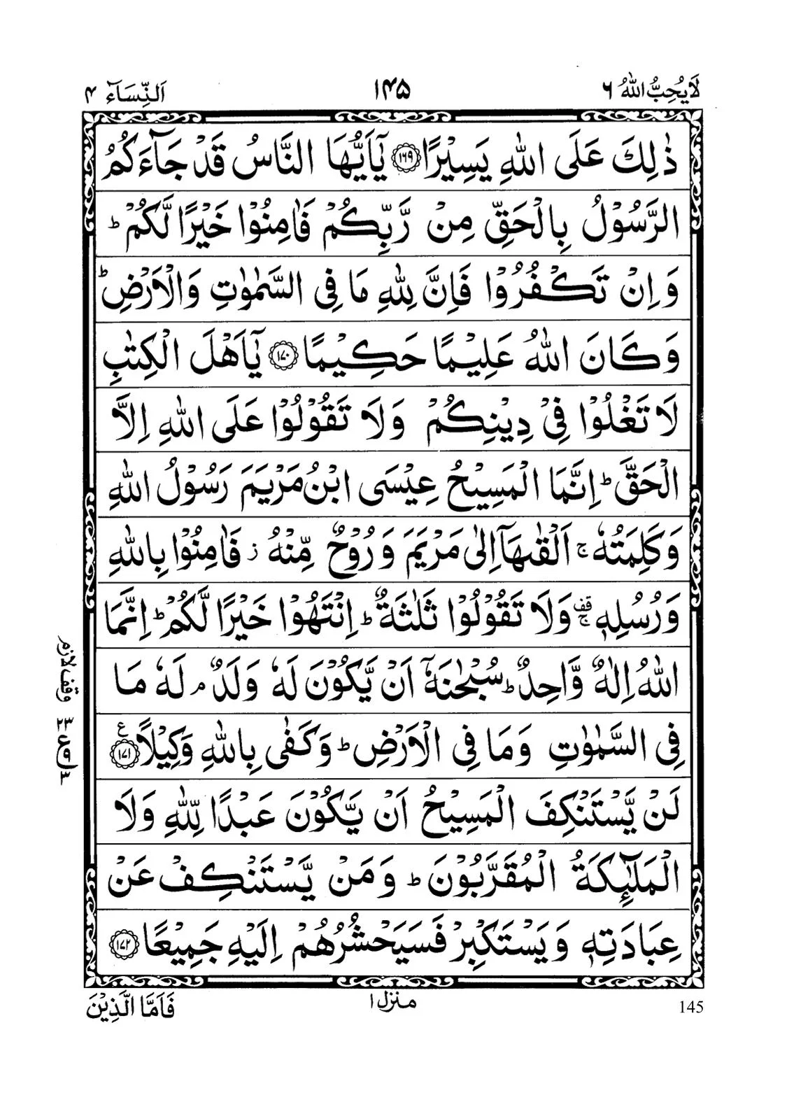 171. Yaaa Ahlal Kitaabi Laa Taghloo Fee Deenikum Wa Laa Taqooloo ‘Alal Laahi Illalhaqq; Innamal Maseehu ‘Eesab-Nu-Maryama Rasoolul Laahi Wa Kalimatuhooo Alqaahaaa Ilaa Maryama Wa Roohum Minhum Fa Aaminoo Billaahi Wa Rusulihee Wa Laa Taqooloo Salaasah; Intahoo Khairallakum; Innamal Laahu Ilaahunw Waahid, Subhaanahooo Any Yakoona Lahoo Walad; Lahoo Maa Fissamaawaati Wa Maa Fil Ard; Wa Kafaa Billaahi Wakeelaa (Section 23)
