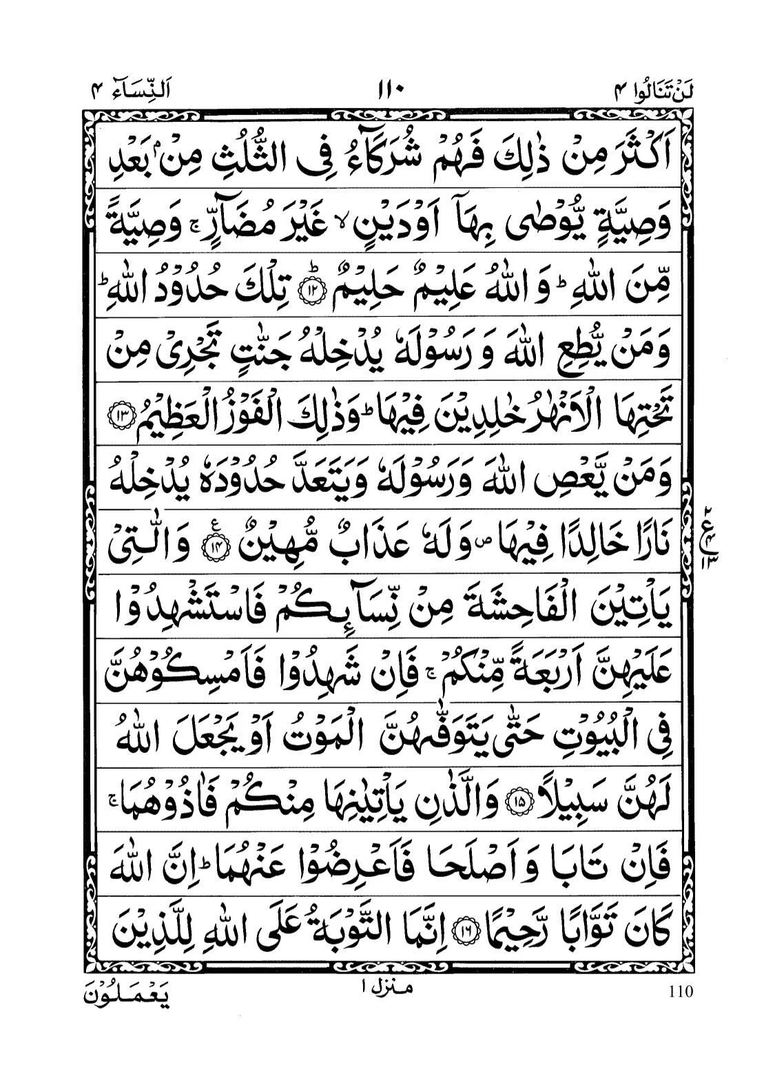 12. Wa Lakum Nisfu Maa Taraka Azwaajukum Il Lam Yakul Lahunna Walad; Fa In Kaana Lahunna Waladun Falakumur Rub’u Mimmaa Tarakna Mim Ba’di Wasiyyatiny Yooseena Bihaaa Aw Dayn; Wa Lahunnar Rubu’u Mimmaa Taraktum Il Lam Yakul Lakum Walad; Fa In Kaana Lakum Waladun Falahunnas Sumunu Mimmaa Taraktum; Mim Ba’di Wasiyyatin Toosoona Bihaaa Aw Dayn; Wa In Kaana Rajuluny Yoorasu Kalaalatan Awim Ra Atunw Wa Lahooo Akhun Aw Ukhtun Falikulli Waahidim Minhumas Sudus; Fa In Kaanooo Aksara Min Zaalika Fahum Shurakaaa’u Fissulus; Mim Ba’di Wasiyyatiny Yoosaa Bihaaa Aw Dainin Ghaira Mudaaarr; Wasiyyatam Minal Laah; Wallaahu ‘Aleemun Haleem